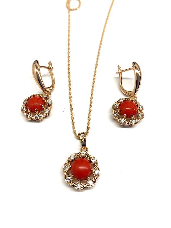 Komplet biżuterii  ze stali chirurgicznej i korala  -kolczyki, łańcuszek z zawieszką
