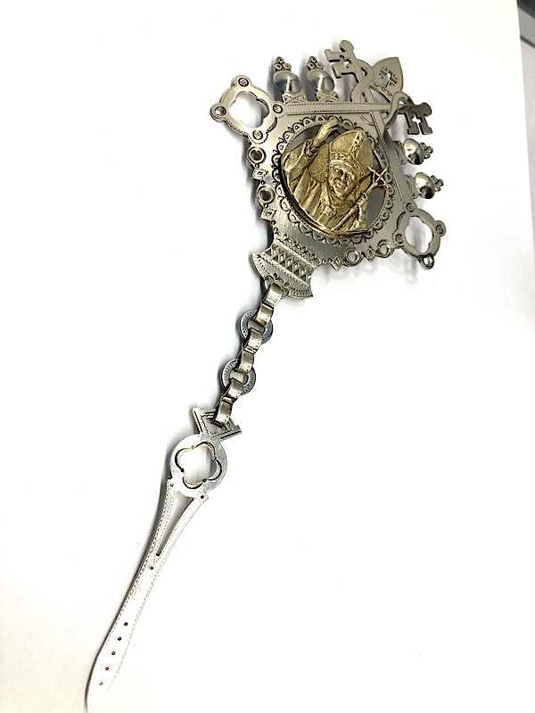 Spinka góralska wykonana z blachy nowosrebrnej alpaki ( kolor srebrny), Ojciec Swięty z mosiądzu ( kolor złoty)